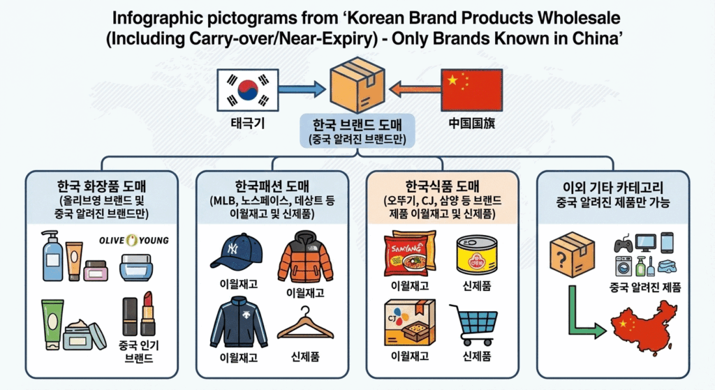 BUSINESS Professional Korea–China trade solutions built on experience and trust 중국법인 개통 중국 해외채널 개통 중국 역직구 판매대행 한국 브랜드 제품 도매 중국총판 연결 중국 셀러 유통 지원 한국 브랜드 제품 도매 Korean Brand Wholesale Supply 이월·임박제품 포함 / 중국 인지도 보유 브랜드 한정 중국 시장 검증된 한국 브랜드 전용 도매 공급 서비스당사는 중국 시장에서 이미 인지도가 형성된 한국 유명 브랜드 제품만을 선별하여 도매 공급합니다.무분별한 브랜드 취급이 아닌, 중국 소비자 인지도·유통 가능성을 기준으로 한 선별형 도매 유통 서비스를 운영합니다.이월 제품, 임박 제품을 포함하여 가격 경쟁력이 확보된 상품을 안정적으로 공급하며, 중국 유통 환경과 플랫폼 정책에 적합한 상품만 취급합니다. 1. 한국 화장품 도매(중국 인지도 보유 브랜드 한정)올리브영 입점 브랜드 중심중국 내 인지도 및 판매 이력 보유 브랜드만 취급이월 제품 및 유통기한 임박 제품 포함 공급 가능중국 유통 기준에 맞는 상품 선별 운영2. 한국 패션 도매(브랜드 제품 이월재고 및 신제품)MLB, The North Face, Descente 등중국 시장에서 인지도가 높은 패션 브랜드 중심이월 재고 및 시즌 신제품 도매 공급중국 도매·온라인 유통에 적합한 물량 구성 3. 한국 식품 도매(브랜드 제품 이월재고 및 신제품)오뚜기, CJ, 삼양 등중국 소비자에게 친숙한 한국 식품 브랜드이월 재고 및 신제품 혼합 공급 가능중국 유통 채널에 맞춘 상품 구성 지원4. 기타 카테고리 도매(중국 인지도 보유 제품만 가능)생활용품, 헬스·뷰티, 잡화 등중국 시장에서 브랜드 인지도가 확인된 제품만 취급유통 리스크를 최소화한 선별 공급 방식